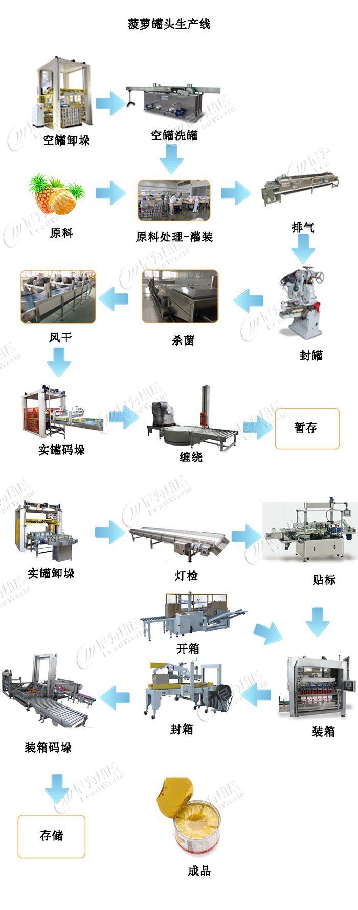 尼為為您提供全套的菠蘿罐頭生產線設備,菠蘿通過預處理、調味后,需要進行裝罐、真空密封、殺菌、貼標、裝箱、全自動碼垛機。這樣既保持了菠蘿的口感又解決了菠蘿的儲存問題。